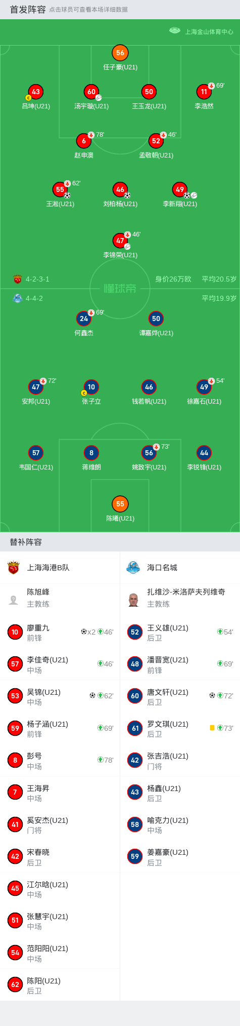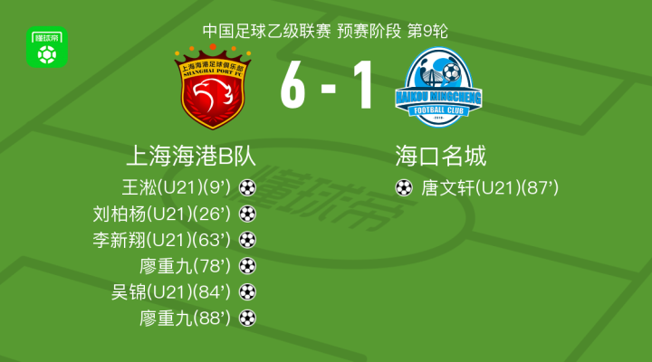 北京时间5月25日中国足球乙级联赛 预赛阶段 第9轮,上海海港B队主场对阵海口名城。上海海港B队王淞破门,刘柏杨破门,李新翔破门,廖重九梅开二度,吴锦破门。海口名城唐文轩破门。最终比分上海海港B队 6-1 海口名城。