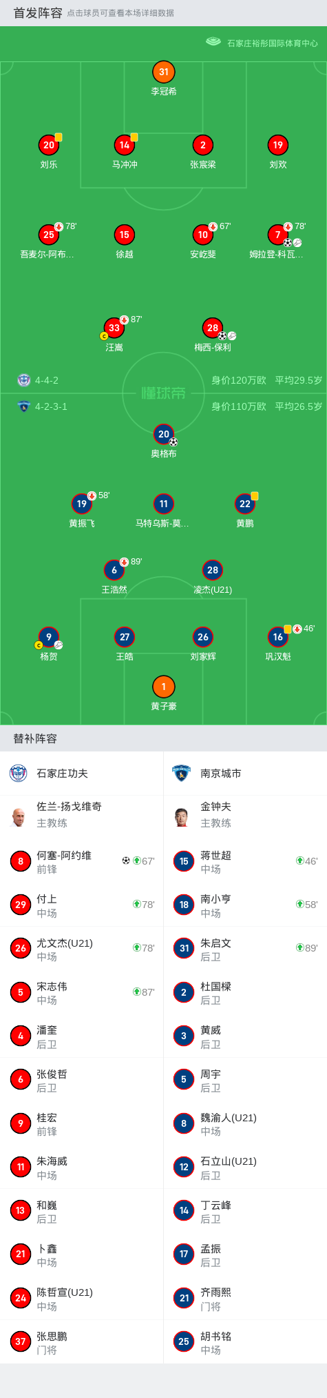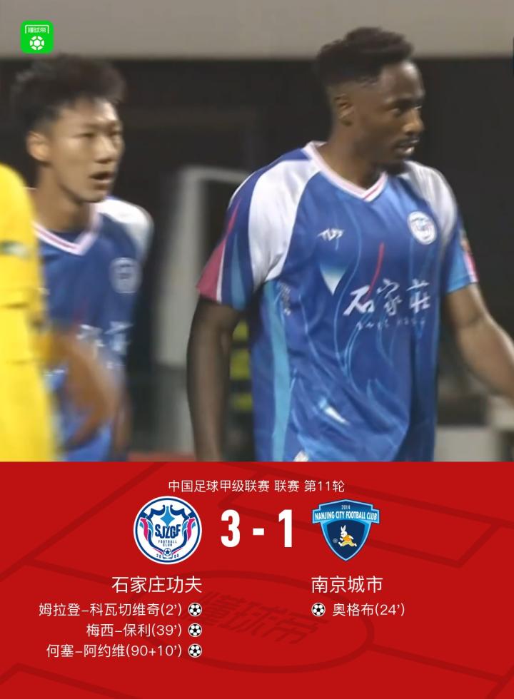 北京时间5月25日中国足球甲级联赛 联赛 第11轮,石家庄功夫主场对阵南京城市。上半场,黄子豪出球失误,科瓦切维奇射门得分先拔头筹。杨贺助攻奥格布破门将比分扳平。梅西-保利推射破门将比分超出。下半场,梅西-保利传中,阿约维破门杀死比赛。最终石家庄功夫主场3-1战胜南京城市。