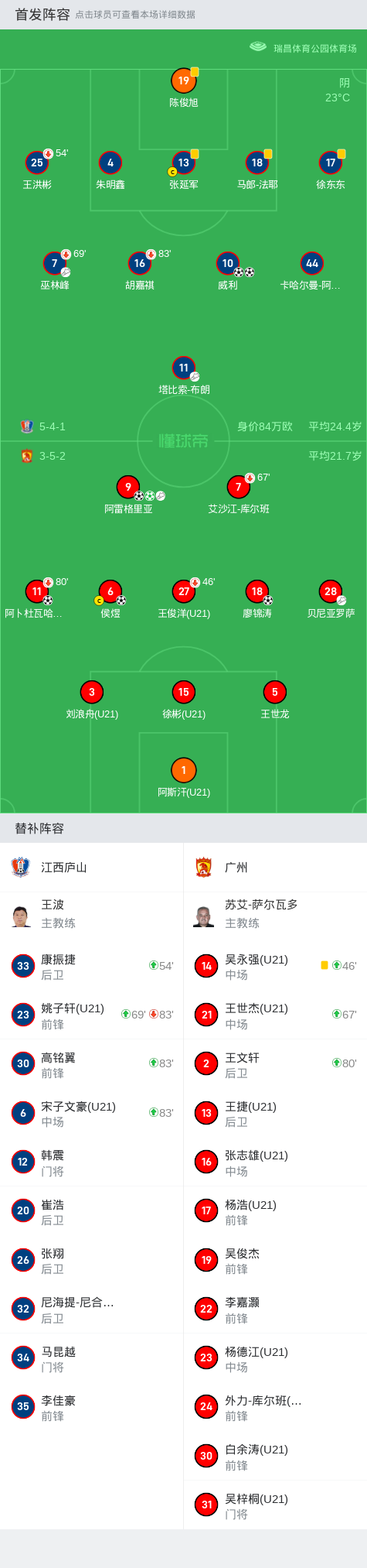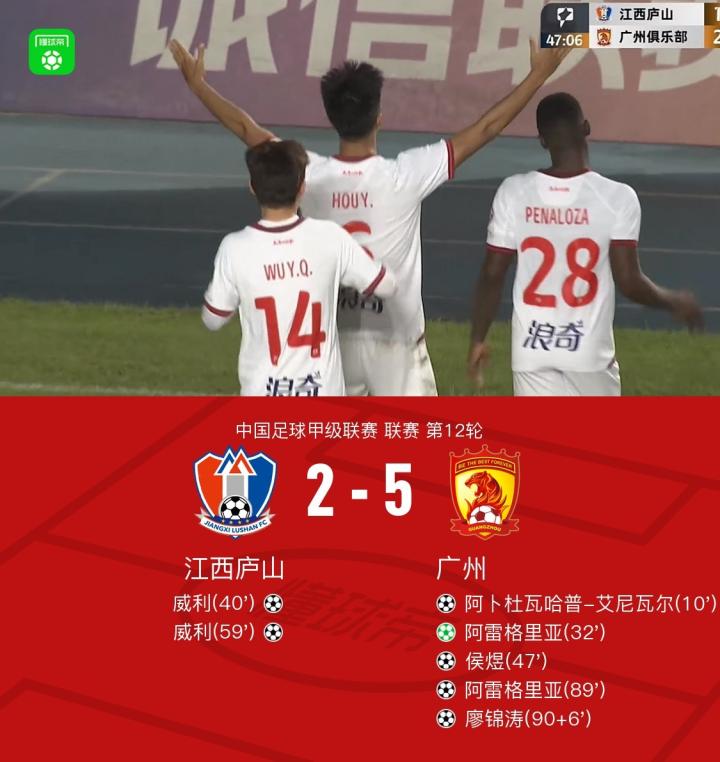 北京时间6月2日中国足球甲级联赛 联赛 第12轮,江西庐山主场对阵广州。上半场,阿卜杜瓦哈普补射破门,阿雷格里亚点射扩大领先,威利帮助江西扳回一球;下半场,侯煜闪击,威利、阿雷格里亚分别双响,补时廖锦涛单刀建功。最终广州客场5-2大胜江西。