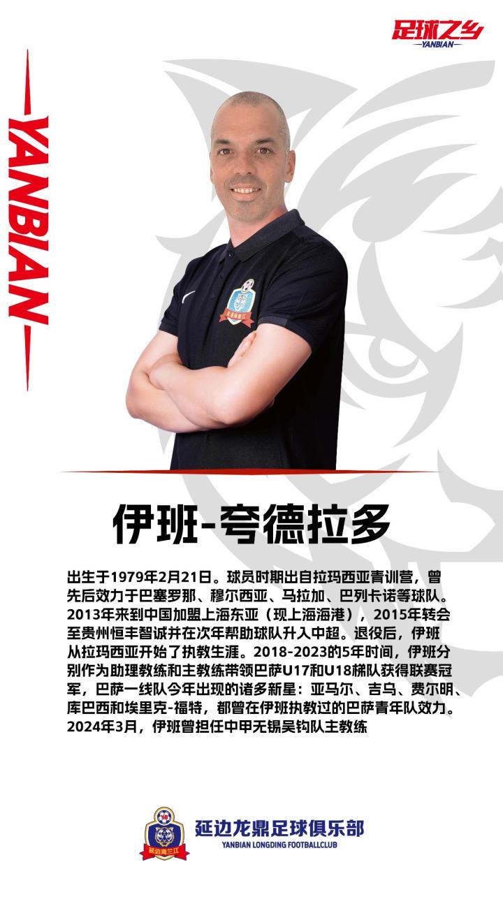 北京时间6月5日,延边龙鼎官方宣布,原无锡吴钩主帅伊班-夸德拉多出任俱乐部一线队主教练一职。