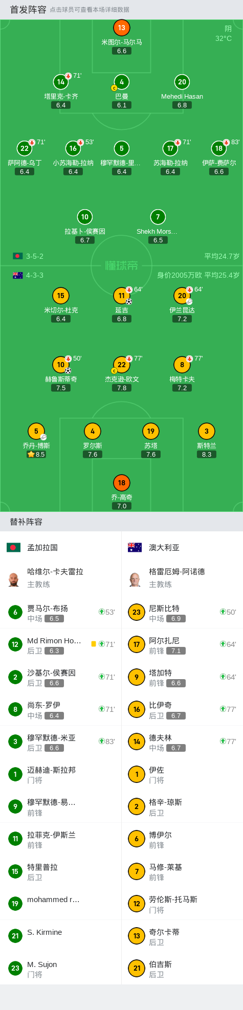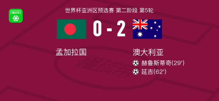 在北京时间6月6日,世界杯亚洲区预选赛第二阶段第5轮中,孟加拉国与澳大利亚展开了激烈的比赛。澳大利亚的赫鲁斯蒂奇和延吉分别攻破了对手的球门,最终比分为孟加拉国0-2澳大利亚。