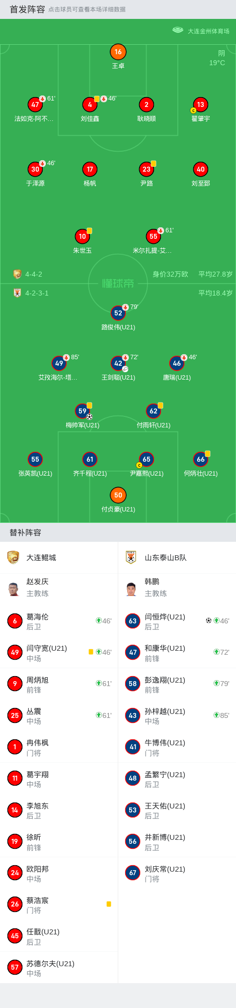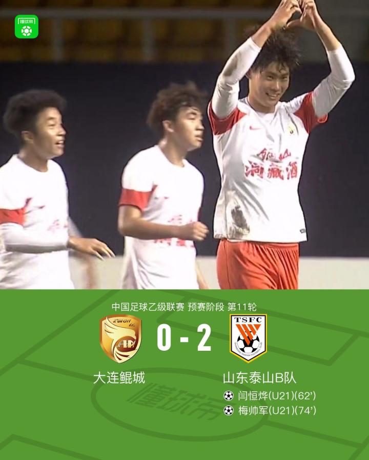 在中国足球乙级联赛预赛阶段第11轮的比赛中,大连鲲城主场迎战山东泰山B队。下半场王剑聪送出助攻,闫恒烨挑射破门,之后尹路没把球顶远,梅帅军跟进劲射破门。最终山东泰山B队2-0客胜大连鲲城。