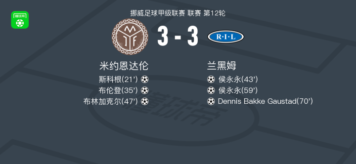北京时间6月9日,挪威足球甲级联赛迎来了第12轮的激烈对决,米约恩达伦与兰黑姆展开了一场激动人心的比赛。斯科根、布伦登和布林加克尔分别为米约恩达伦队攻入进球,而兰黑姆队则由侯永永梅开二度,Dennis Bakke Gaustad也有一次精彩的进球。最终,双方握手言和,比分定格在3-3。