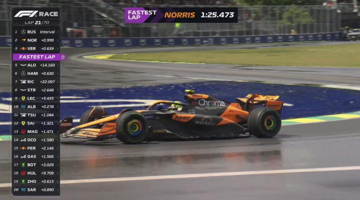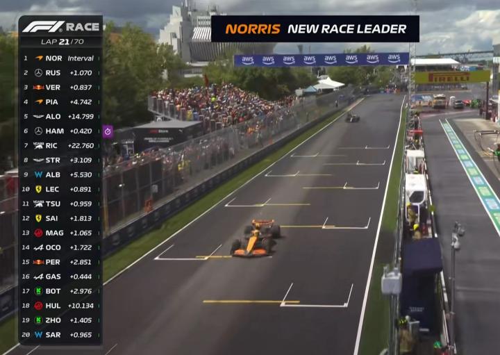 第21圈!诺里斯超越拉塞尔!来到全场第一!同时拉塞尔出现失误,落到第三!