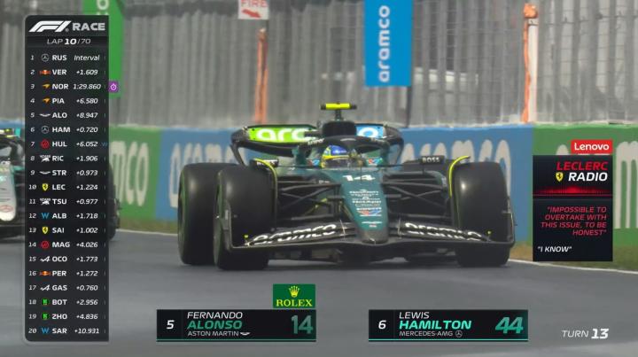 第10圈,勒克莱尔表示赛车的问题使得他不可能在直道上完成超车!