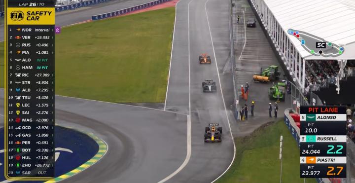 第26圈!诺里斯之后的维斯塔潘、拉塞尔、阿隆索、周冠宇全部选择进站更换一套新的半雨胎!