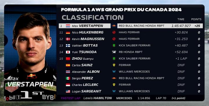 第70圈!维斯塔潘冲线!拿下加拿大大奖赛的冠军!!!