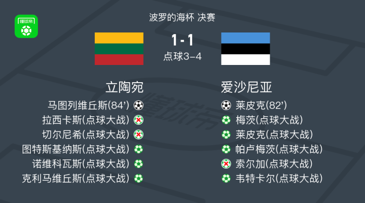 北京时间6月12日,波罗的海杯决赛在立陶宛主场展开,立陶宛队迎战爱沙尼亚队。比赛中,爱沙尼亚球员莱皮克率先打入一球,随后立陶宛球员拉西卡斯助攻马图列维丘斯扳平比分。比赛进入补时阶段后,双方展开了激烈的点球大战。爱沙尼亚的梅茨、莱皮克、帕卢梅茨和韦特卡尔相继罚进点球,而立陶宛的图特斯基纳斯、诺维科瓦斯和克利马维丘斯也不甘示弱,纷纷命中点球。最终,爱沙尼亚队以5-4险胜立陶宛队,赢得了本届波罗的海杯的冠军。
