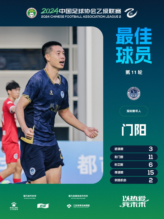 北京时间6月13日,中乙官方宣布,上演帽子戏法的深圳青年人前锋门阳当选联赛第11轮最佳球员。