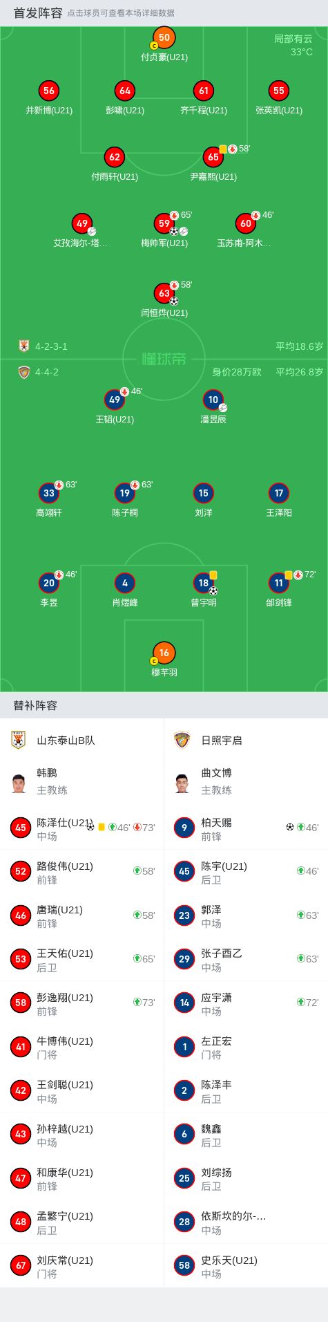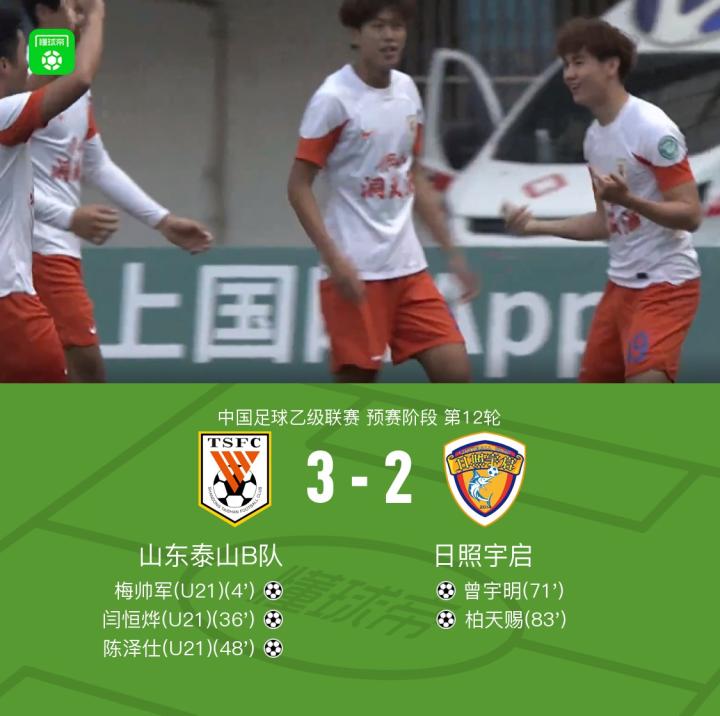 在中国足球乙级联赛预赛阶段第12轮比赛中,山东泰山B队迎战日照宇启。梅帅军、闫恒烨和陈泽仕分别先后为山东泰山B队进球,日照宇启曾宇明与柏天赐连续扳回两球。最终,山东泰山B队以3-2日照宇启。