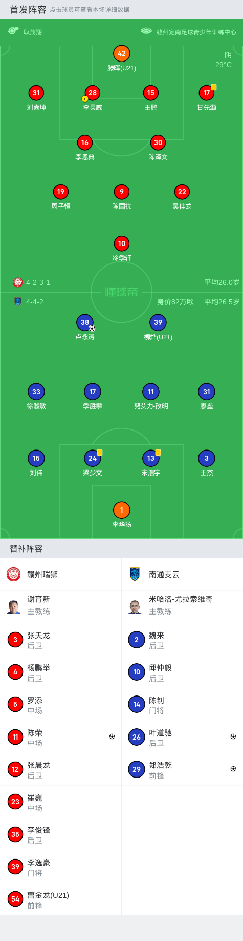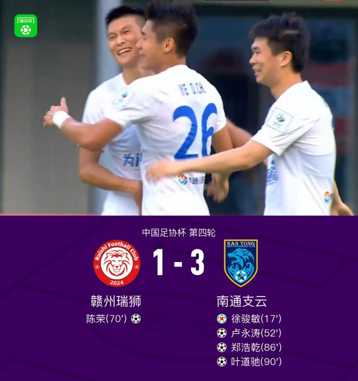 在中国足协杯第四轮的比赛中,赣州瑞狮坐镇主场迎战南通支云。上半场双方互交白卷,徐骏敏造点,主罚点球被滕辉扑出。季胜攀补射击中横梁。下半场,卢永涛头球破门打破僵局,曹金龙脚后跟回做,陈荣跟上射门将比分扳平。陈荣单刀不进,郑浩乾挑射破门将比分超出,叶道驰最后一分钟破门锁定比分。最终南通支云3-1战胜赣州瑞狮成功晋级。