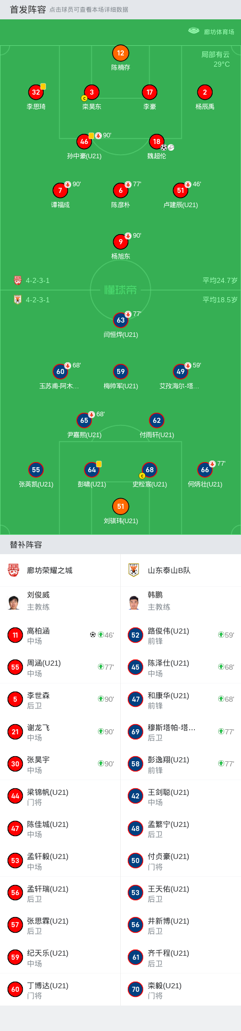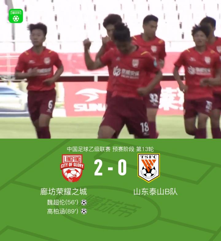 北京时间6月23日,中国足球乙级联赛预赛阶段第13轮,廊坊荣耀之城主场迎战山东泰山B队。比赛中,廊坊荣耀之城的魏超伦率先打破僵局,随后他又助攻高柏涵再下一城。最终,廊坊荣耀之城以2-0战胜山东泰山B队。