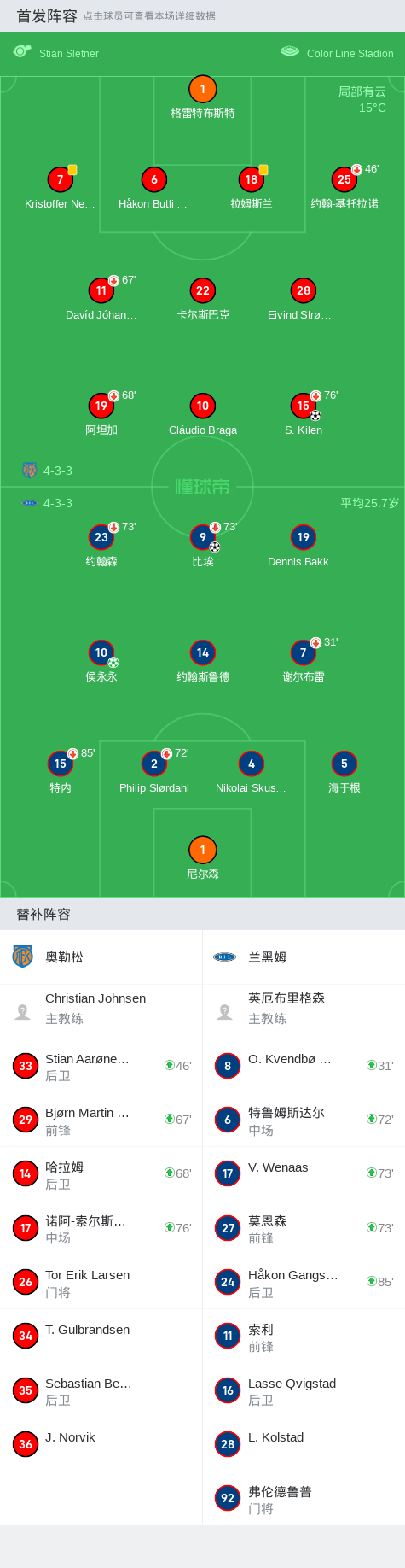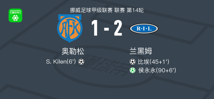 北京时间6月23日,挪威足球甲级联赛第14轮,奥勒松主场迎战兰黑姆。比赛中,奥勒松的S. Kilen率先破门,为主队取得领先。随后,兰黑姆的比埃扳平比分。比赛接近尾声时,兰黑姆的侯永永通过点球得分,帮助球队反超。最终,奥勒松以1-2不敌兰黑姆。