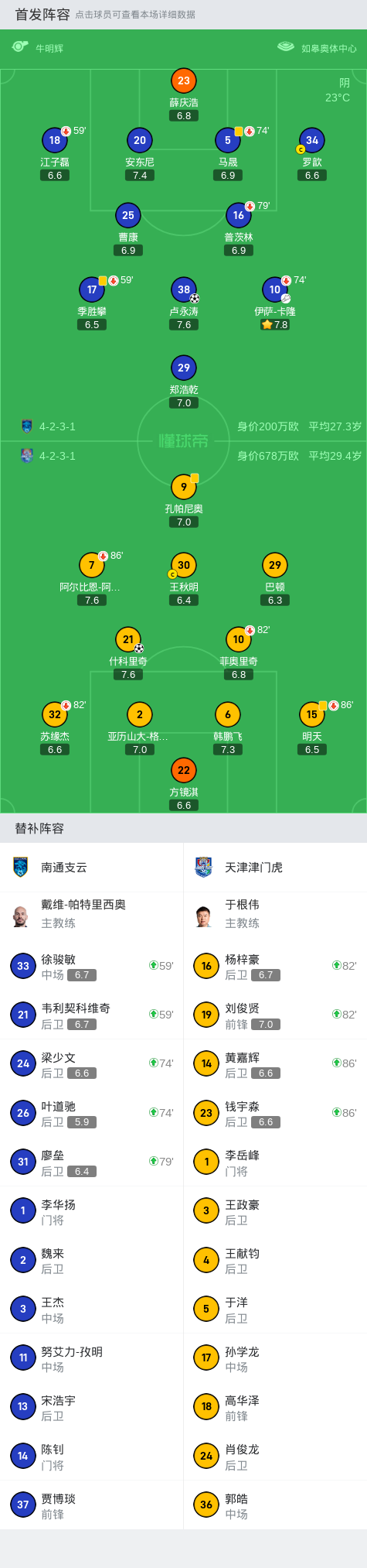 北京时间6月25日晚间19:35,中超联赛第16轮,南通支云坐镇主场如皋奥体中心,迎战天津津门虎,本场比赛主裁判为牛明辉,VAR视频助理裁判为王巍。上半场,阿代米险些造成对方球员自摆乌龙,卢永涛头球破门。下半场,什科里奇破门但越位在先,终场结束前,刘俊贤远射中柱,随后什科里奇完成绝平。最终,南通支云1-1天津津门虎。