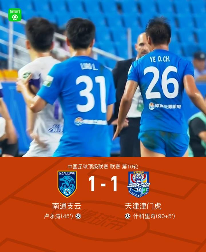 第90+5分钟,刘俊贤远射击中横梁,随后什科里奇破门绝平,津门虎1-1南通
