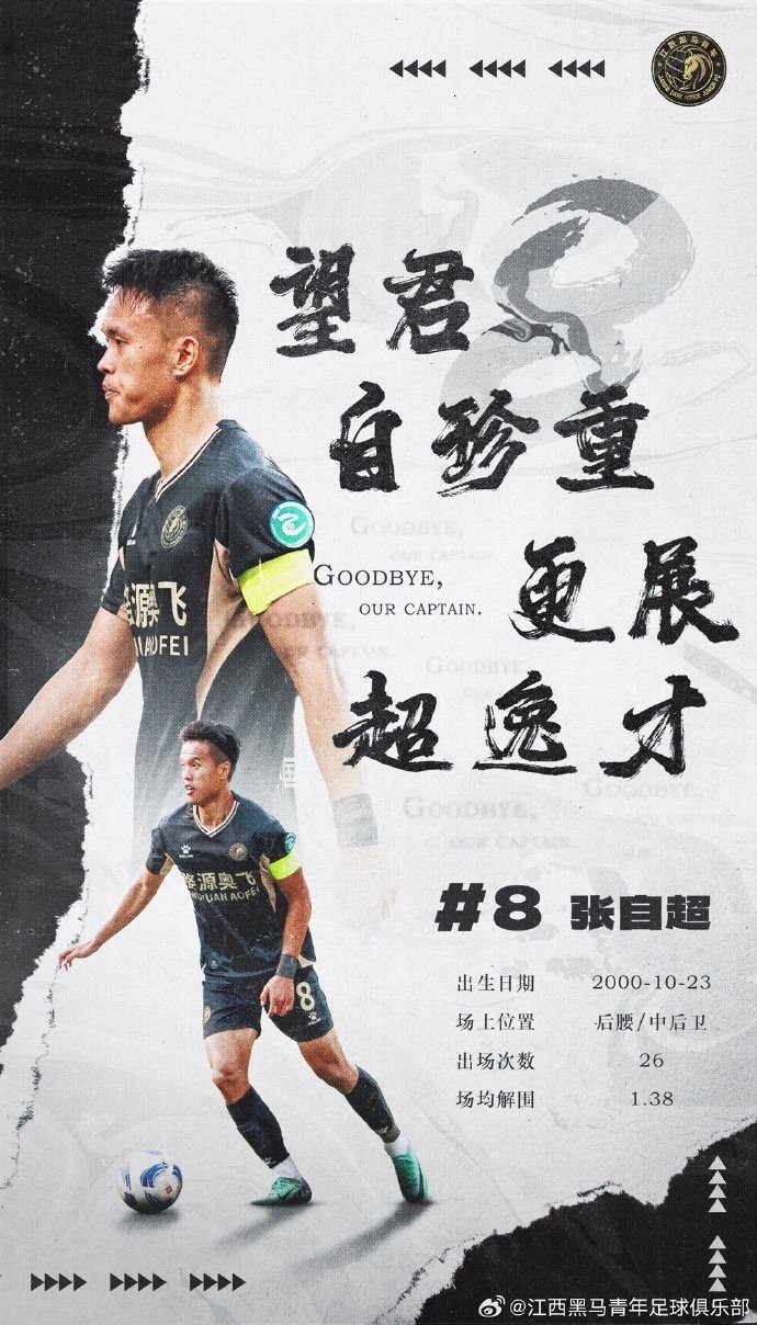 望君“自”珍重,更展“超”逸才。江西黑马青年足球俱乐部衷心祝愿球队队长张自超未来的职业生涯一切顺利,充分发挥自己的能力,帮助球队再创佳绩。