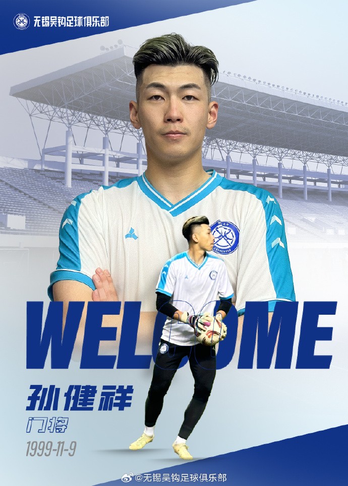 我们在此郑重宣布,经双方友好协商达成一致,即日起,守门员孙健祥租借加盟无锡吴钩足球俱乐部,将随队征战中甲联赛及俱乐部相关赛事。