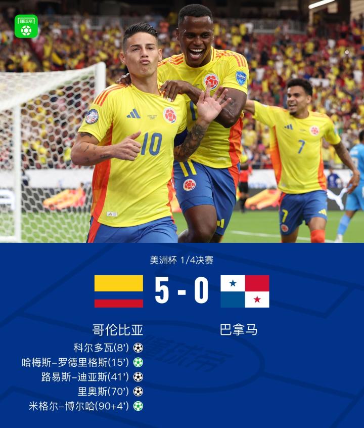 扫描下载懂球帝首页>动态> 哥伦比亚5-0巴拿马晋级4强,J罗1射2传,迪亚斯吊射破门