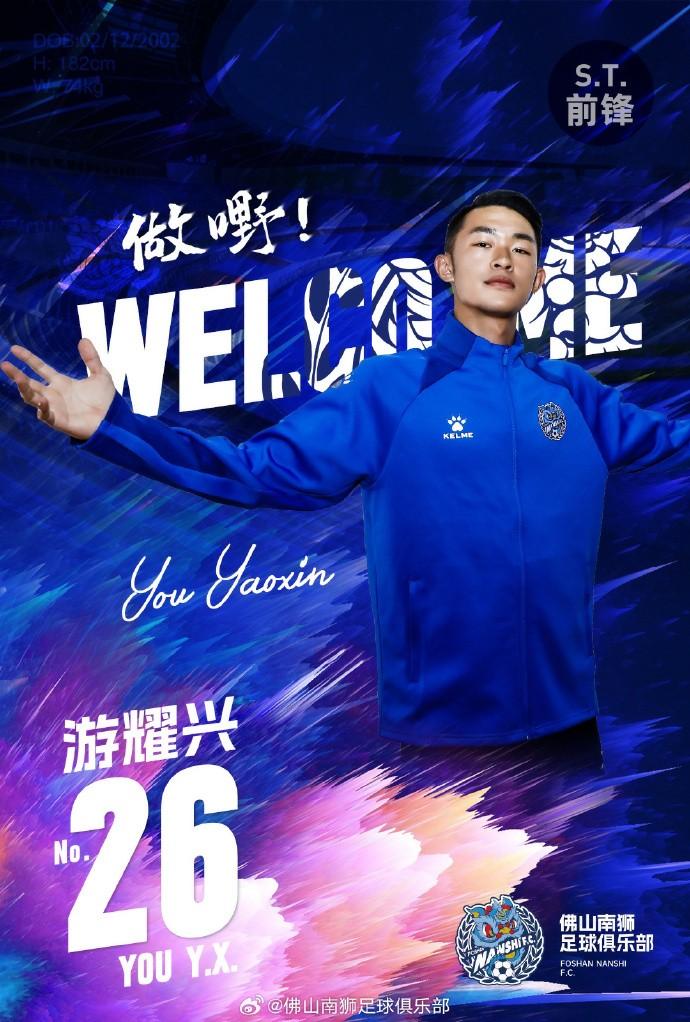 经与本人协商一致,即日起,来自中国台湾的年轻前锋游耀兴正式加盟佛山南狮足球俱乐部,成为俱乐部的新锐力量。他将身披26号战袍,为佛山而战!