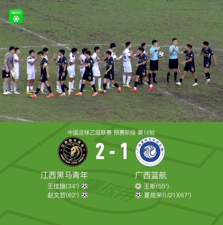 北京时间7月14日,中国足球乙级联赛预赛阶段第16轮,江西黑马青年主场迎战广西蓝航。比赛中,江西黑马青年的刘芮成助攻王佳旗率先破门,随后耿泰立助攻赵文哲再下一城。尽管广西蓝航的王斯错失点球机会,但夏政荣随后为球队扳回一球。最终,江西黑马青年以2-1战胜广西蓝航。