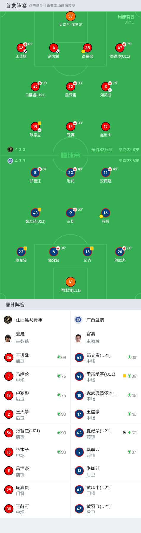 第34分钟,先拔头筹,王佳旗禁区停球转身铲射破门,江西黑马青年1-0