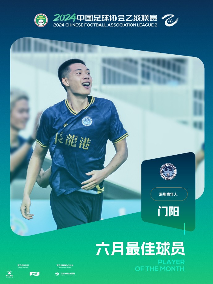 北京时间7月19日,中乙官方宣布,深圳青年人前锋门阳当选联赛6月最佳球员。