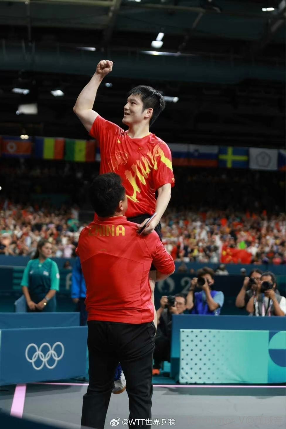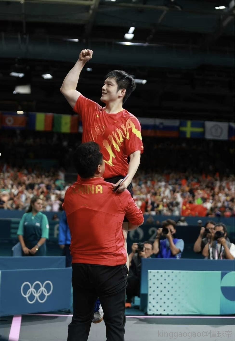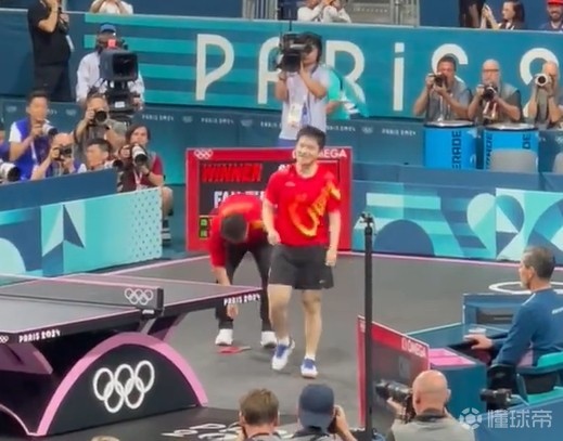 赛后出现暖心一幕,樊振东拿到金牌后激动地把球拍放在地上和王皓拥抱,随后王皓在后面贴心地帮他把球拍捡起来。