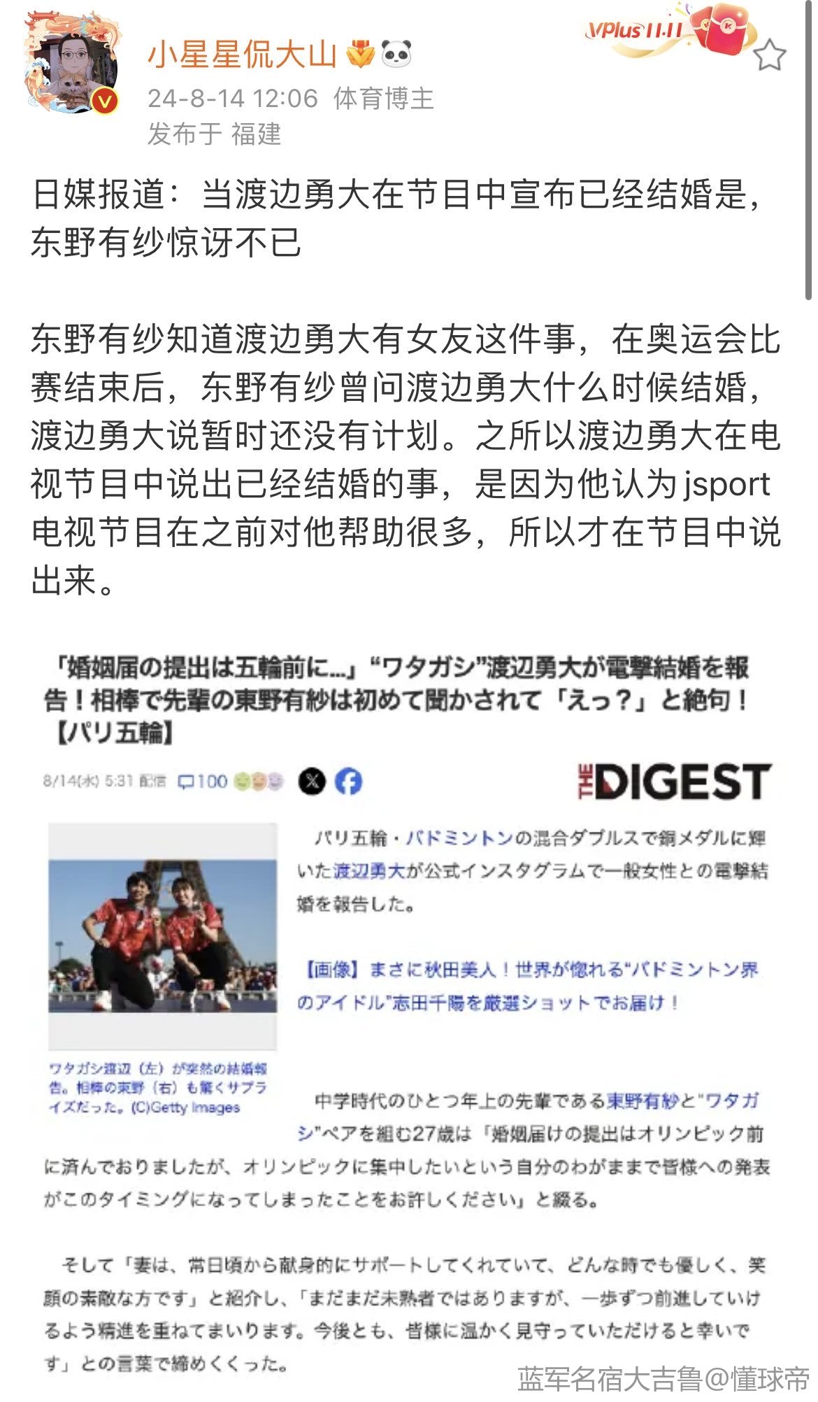 前世界第一、连续两届奥运会获得混双铜牌的日本羽毛球组合渡边勇大/东野有纱宣布解散。