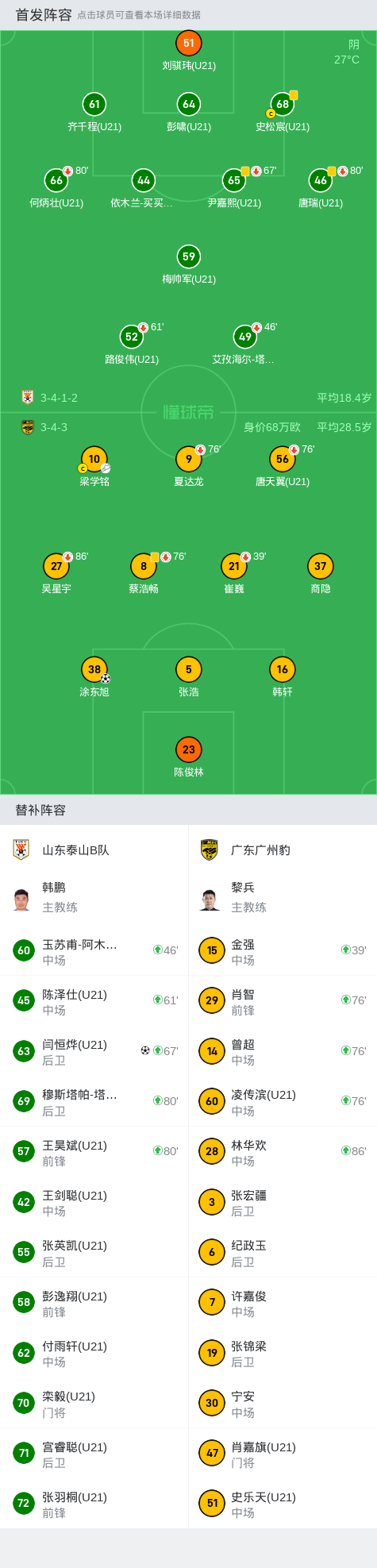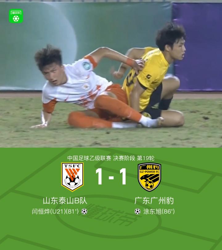 北京时间8月18日,中国足球乙级联赛决赛阶段第19轮,山东泰山B队主场迎战广东广州豹。上半场双方互交白卷,场面上客队占据上风。右路斜传禁区,涂东旭头球稍稍高出。下半场,玉苏甫-阿木提传中,闫恒烨破门打破僵局。梁学铭角球开出,涂东旭头球破门将比分扳平。最终山东泰山B队主场1-1战平广东广州豹。