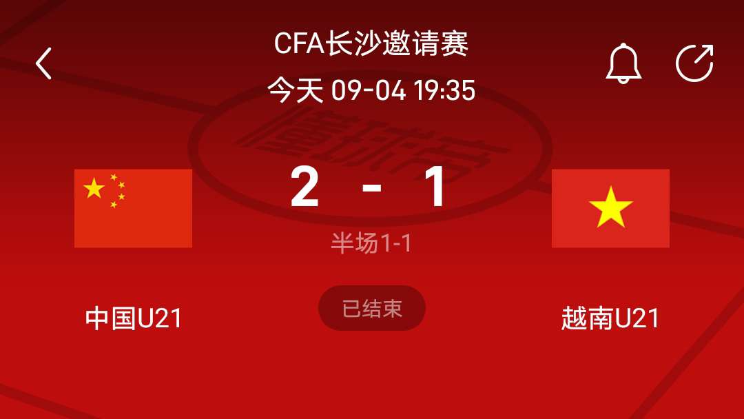 北京时间9月4日,CFA中国之队长沙国际足球邀请赛迎来了中国U21与越南U21的对决。上半场第14分钟,木塔力甫送助攻,艾菲尔丁率先破门,上半场补时阶段,鲍世蒙解围送大礼,阮国越扳平比分,第87分钟,越南队绝佳机会中柱,第88分钟,何小珂小角度射门绝杀对手。最终,中国U21以2-1战胜越南U21。