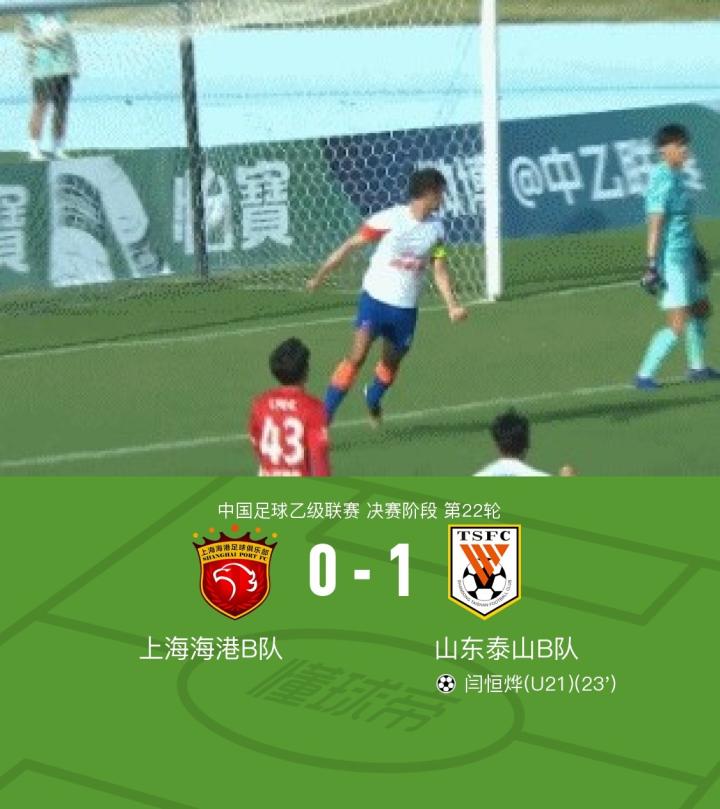 第23分钟,闫恒烨禁区甩头破门,山东泰山B队1-0领先