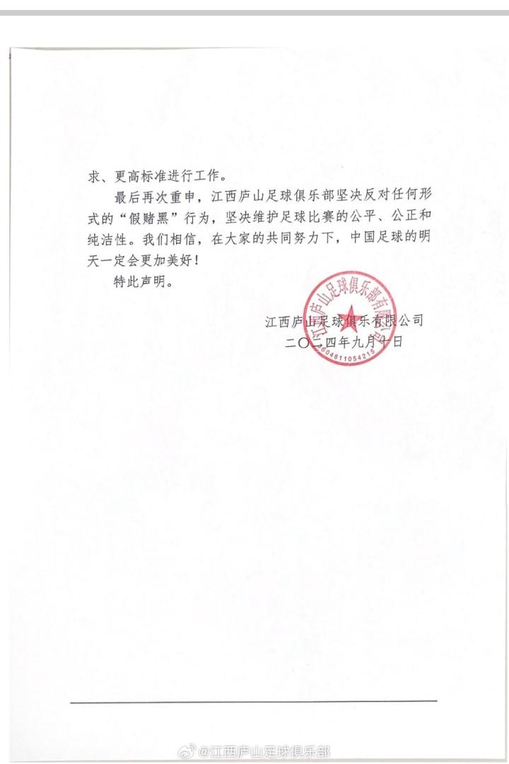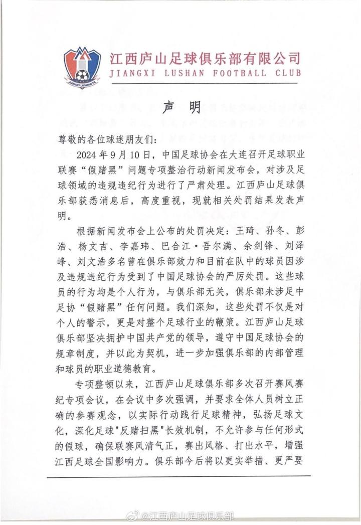 官方声明中写道:王琦、孙冬、彭浩、杨文吉、李嘉玮、巴合江-吾尔满、余剑锋、刘泽峰、刘文浩多名曾在俱乐部效力和目前在队中的球员因涉及违规违纪行为受到了中国足球协会的严厉处罚。这些球员的行为均是个人行为,与俱乐部无关,俱乐部未涉足中足协“假赌黑”任何问题。我们深知,这些处罚不仅是对个人的警示,更是对整个足球行业的鞭策。江西庐山足球俱乐部坚决拥护中国共产党的领导,遵守中国足球协会的规章制度,并以此为契机,进一步加强俱乐部的内部管理和球员的职业道德教育。