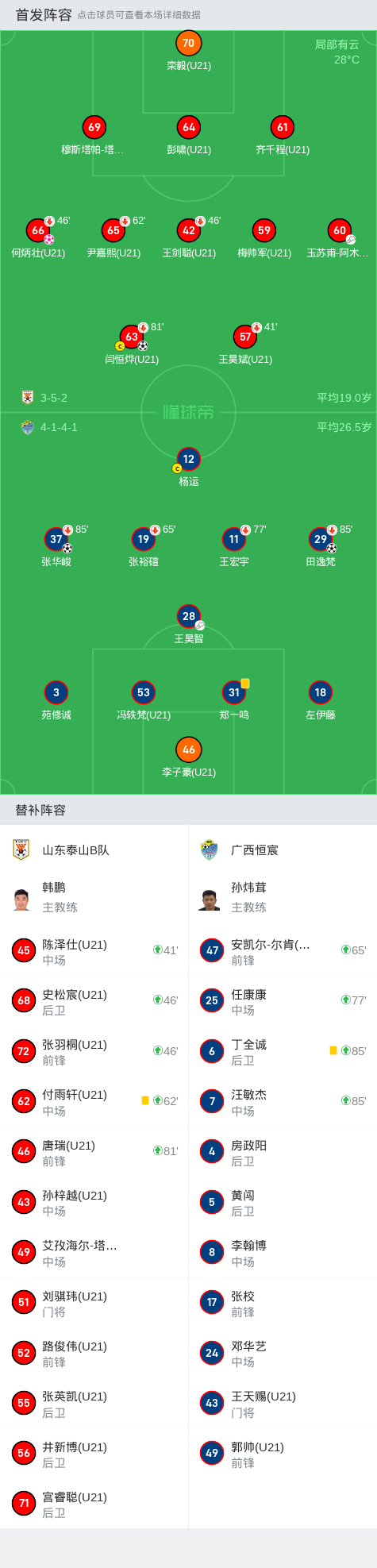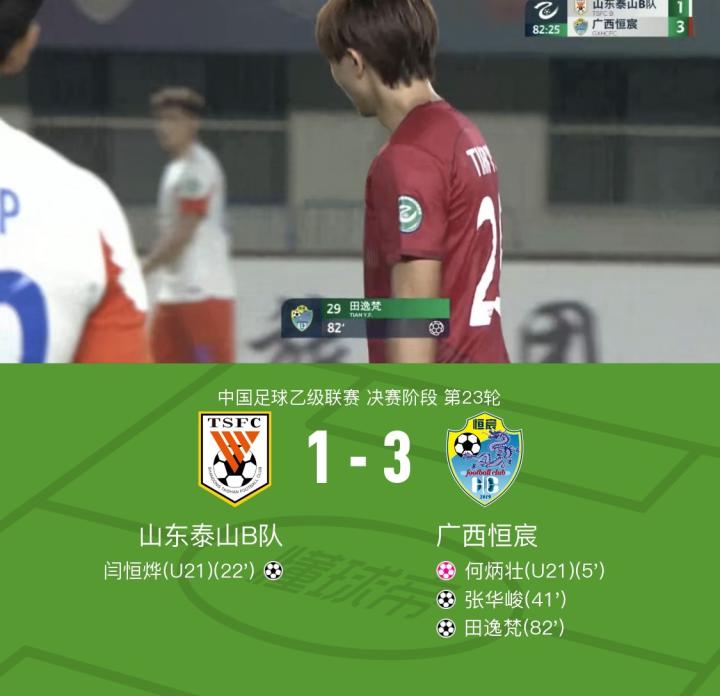 北京时间9月15日,中国足球乙级联赛决赛阶段第23轮,山东泰山B队主场迎战广西恒宸。比赛中,山东泰山B队的何炳壮不慎自摆乌龙,随后玉苏甫-阿木提助攻闫恒烨为主队扳回一城。广西恒宸方面,王昊智助攻张华峻打入一球,任康康助攻田逸梵再下一城。最终,山东泰山B队以1-3不敌广西恒宸。