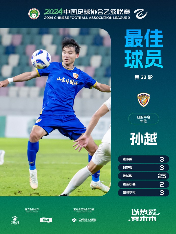 中乙联赛官方宣布,日照宇启球员孙越满分当选为第23轮最佳球员。