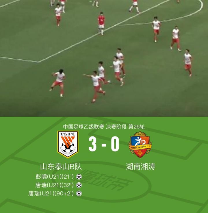 在中国足球乙级联赛决赛阶段的较量中,山东泰山B队坐镇主场迎战湖南湘涛。比赛中,山东泰山B队展现了强大的进攻实力。首先,玉苏甫-阿木提为彭啸送出精妙助攻,帮助球队取得领先。随后,唐瑞表现出色,再次为球队扩大优势。比赛接近尾声时,唐瑞再度建功,完成个人本场比赛的第二粒进球。最终,山东泰山B队以3-0的比分完胜湖南湘涛,取得了一场令人信服的胜利。