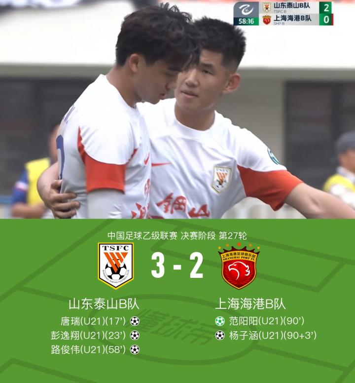 在中国足球乙级联赛决赛阶段的较量中,山东泰山B队坐镇主场迎战上海海港B队。比赛中,山东泰山B队展现了强大的进攻实力。唐瑞率先为主队打开局面,随后路俊伟送出精妙助攻,帮助彭逸翔再下一城。路俊伟随后也为球队贡献了一粒精彩的进球。 尽管上海海港B队在比赛后段奋力反击,范阳阳通过点球为客队扳回一城,杨子涵在补时阶段再度破门,但最终未能改变比赛结果。山东泰山B队以3-2的比分力克对手,取得了这场激烈对决的胜利。