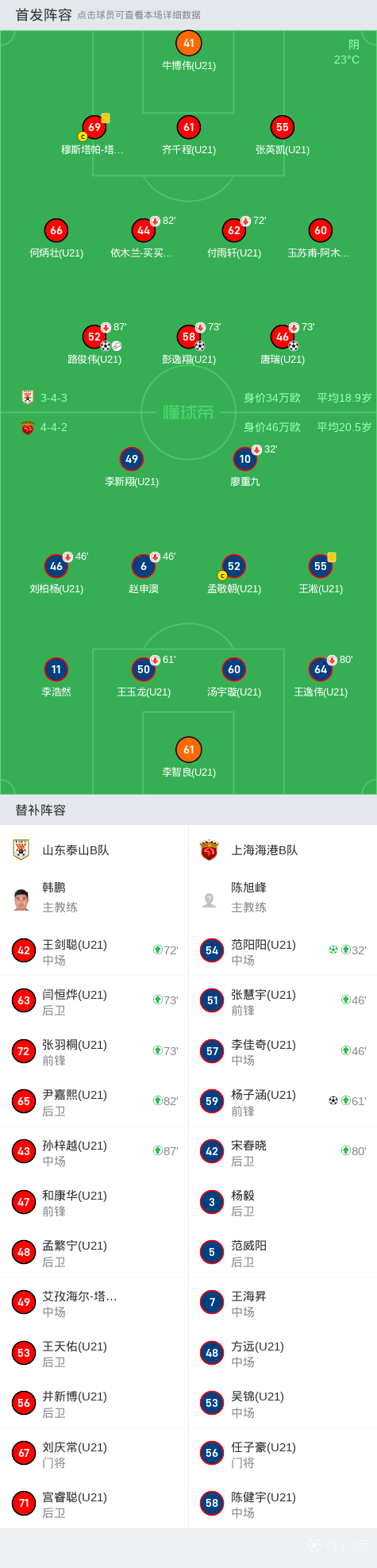 第23分钟,山东泰山B队球员路俊伟助攻彭逸翔打入一球。