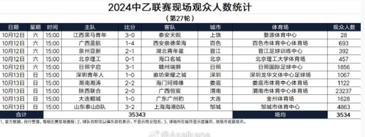 目前,中乙第27轮的比赛全部结束,现场观众人数方面,陕西联合主场23237人最多,山东泰山B队主场4863人排第二。本轮平均观众人数为3534人。