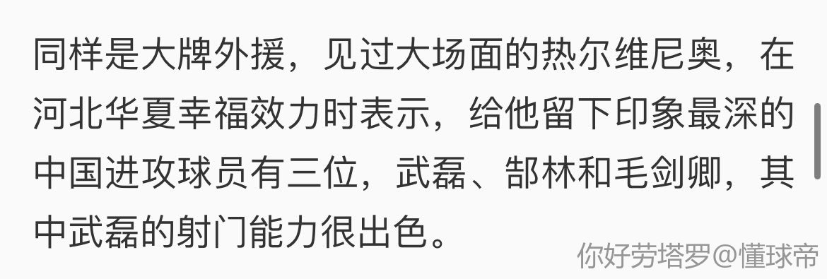 同样是大牌外援,见过大场面的热尔维尼奥,在河北华夏幸福效力时表示,给他留下印象最深的中国进攻球员有三位,武磊、郜林和毛剑卿,其中武磊的射门能力很出色。