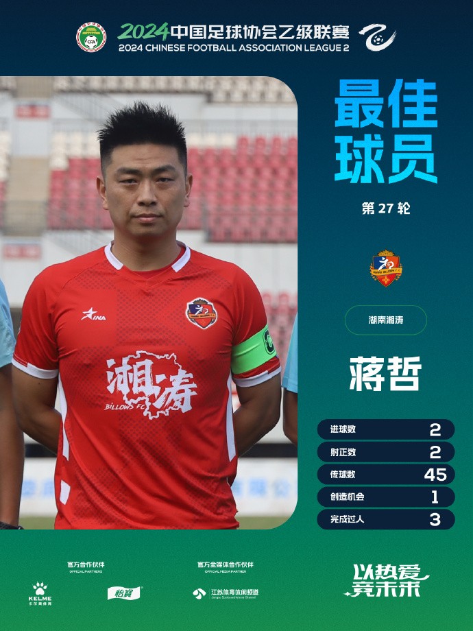 北京时间10月17日,中乙官方宣布,湖南湘涛后卫蒋哲当选联赛第27轮最佳球员。