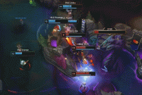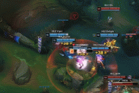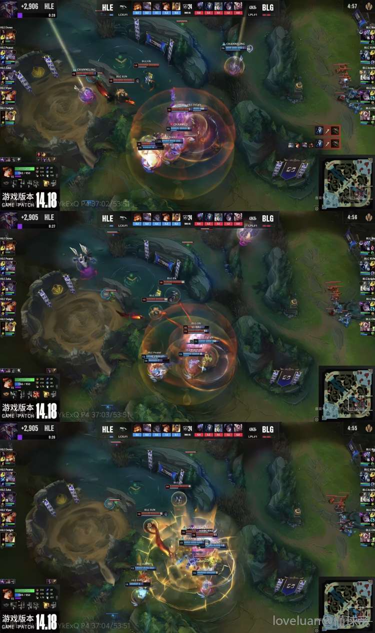 第25分钟,大龙团,双方中辅互换,后续残局HLE打出1换4团灭BLG拿下大龙,7-8。