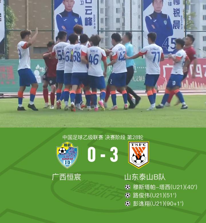 在中国足球乙级联赛决赛阶段的较量中,山东泰山B队客场挑战广西恒宸。比赛中,山东泰山B队展现了强大的进攻实力。首先,穆斯塔帕-塔西接到玉苏甫-阿木提的精妙传球,成功破门,为球队首开纪录。随后,路俊伟再度攻入一球,进一步扩大了领先优势。比赛接近尾声时,陈泽仕助攻彭逸翔,后者将球送入网底,为山东泰山B队锁定胜局。最终,山东泰山B队以3比0的比分完胜广西恒宸,取得了一场精彩的胜利。