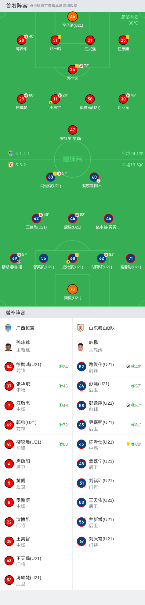 第51分钟,山东泰山B队球员路俊伟打入一球。