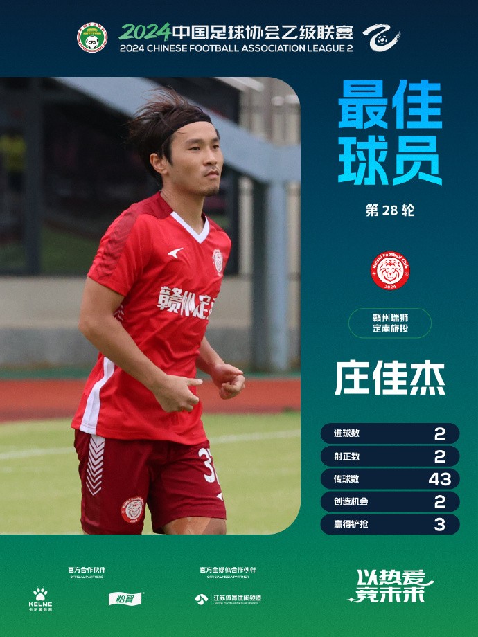 北京时间10月23日,中乙官方宣布,赣州瑞狮中场庄佳杰当选联赛第28轮最佳球员。