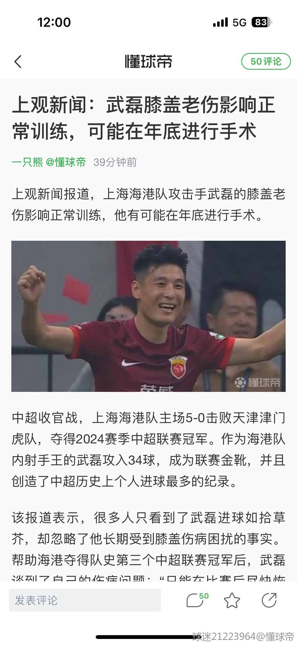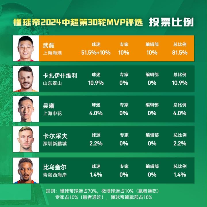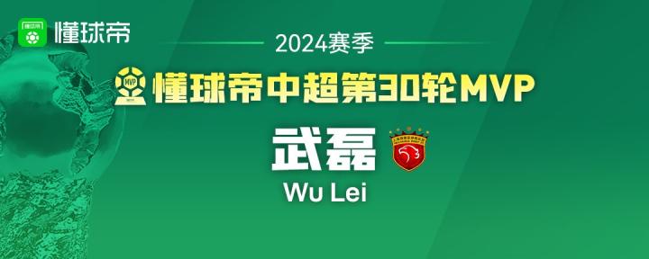 大家好,欢迎来到懂球帝2024赛季中超MVP评选现场。中超第30轮MVP的最终获奖者毫无悬念,属于收官战独造5球率队夺冠的武磊!