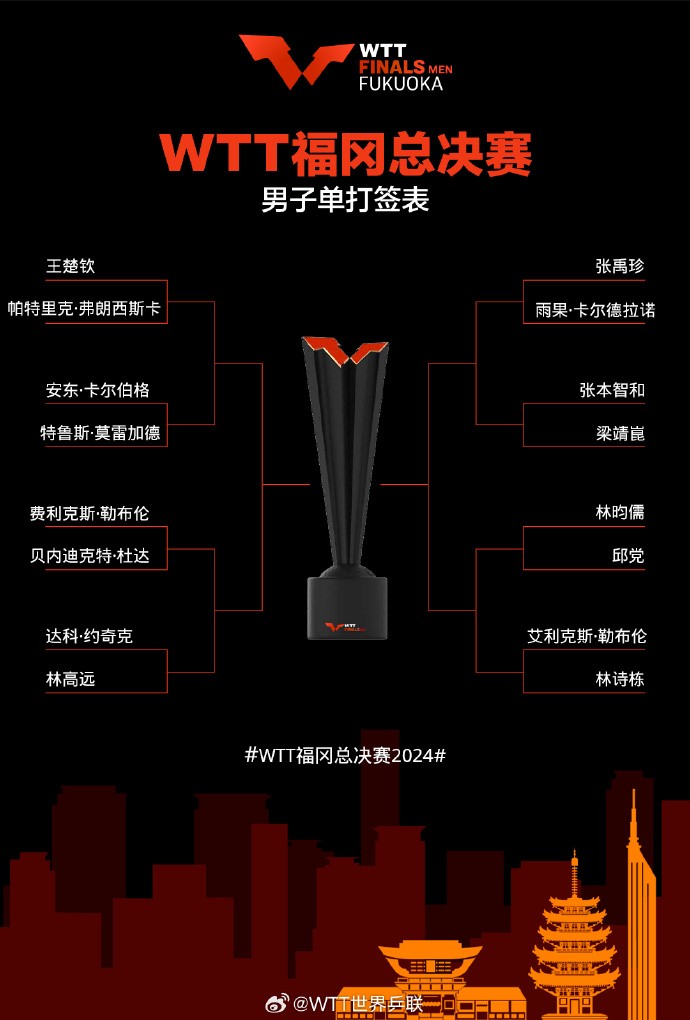 扫描下载懂球帝首页>动态> WTT总决赛男单签表:王楚钦与莫雷加德、卡尔伯格、小勒布伦同一半区