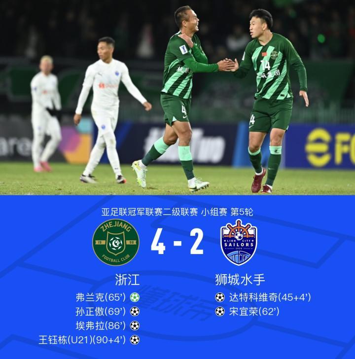 在亚足联冠军联赛小组赛的一场激烈对决中,浙江与狮城水手展开了精彩较量。上半场,阿努阿尔单刀打门被赵博出击封堵,高迪顺势打门击中横梁,达特科维奇铲射破门取得领先;下半场,王瑒再次失误后赵博出击化解危机,王瑒后场传球失误被断后宋宜荣远射得手,孙国文造点后弗兰克点射命中扳回一球,埃弗拉助攻孙正傲门前抢点扳平,王钰栋抢射打到门将后反弹中柱,王钰栋助攻埃弗拉上演逆转,李提香精准斜塞助攻王钰栋杀死比赛。