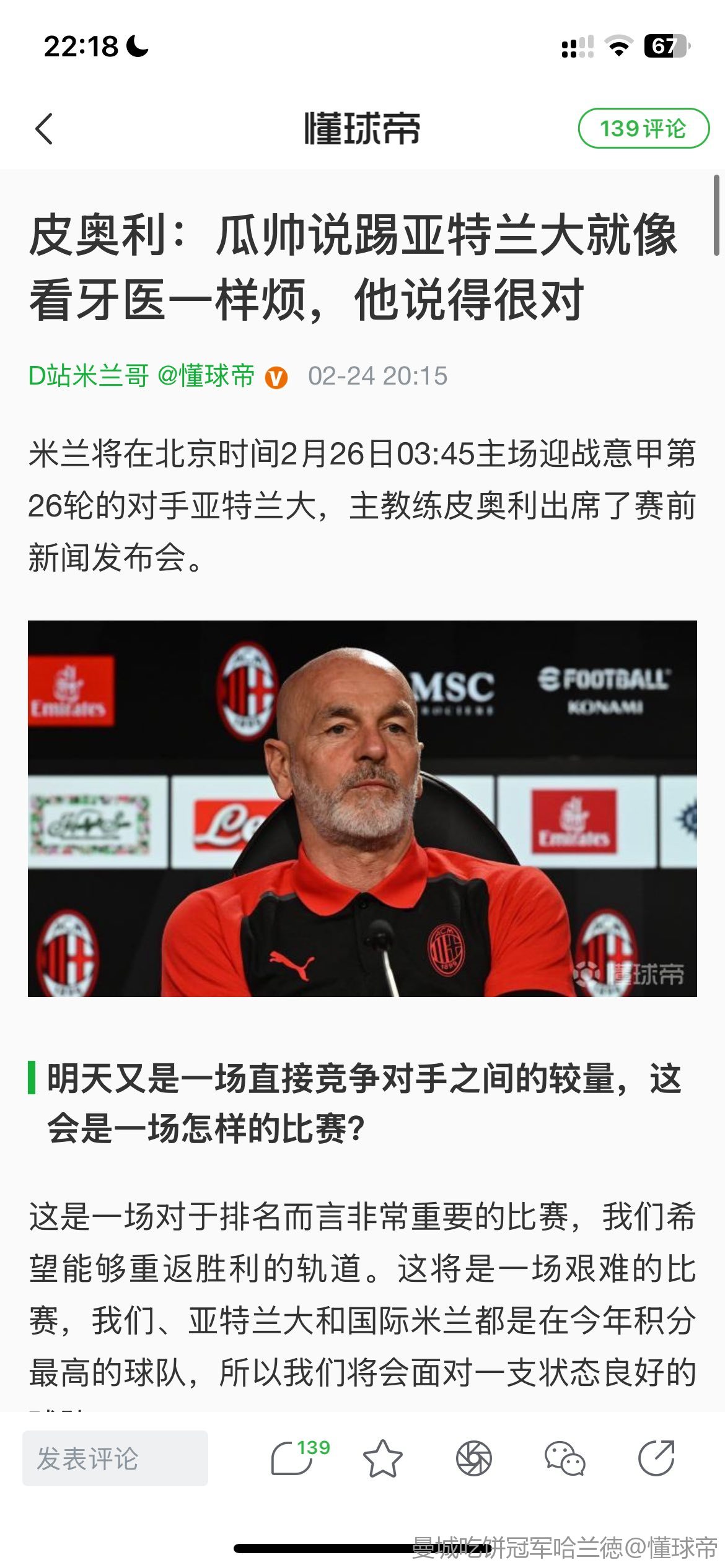 我不喜欢谈论自己,应该由你们来谈论我才对。我能说的是,我在意大利感觉非常好,对于一位外籍教练来说,这里非常能激励人。这里与众不同,它更能激发我的斗志,让我找到了看待事物的不同方式。意甲对我来说显然是不同的,这几天我和我的教练组交流,说只有在这里你才能明白它有多么不同。不在这里的教练无法确切了解意甲是什么样的,以及它给教练都带来了什么。在这里获胜非常非常困难,现在欧洲的大球队都有机会面对意大利球队,让我们看看结果吧。那么结果怎么样?所以想想每周都要面对意大利球队是什么感觉吧,这真的很难。