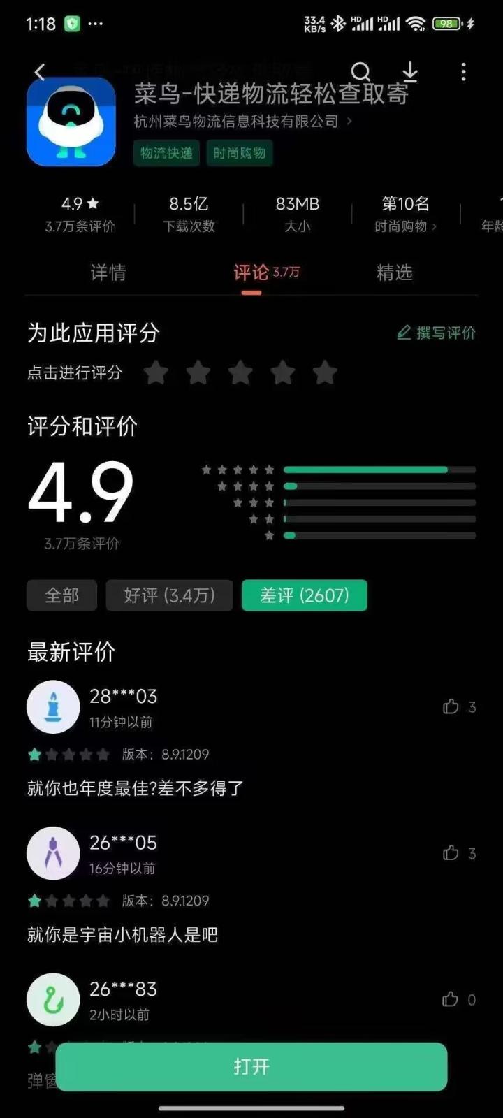 懂球帝首页>动态> 难绷,因图标神似宇宙机器人,菜鸟app被网友疯狂打低分