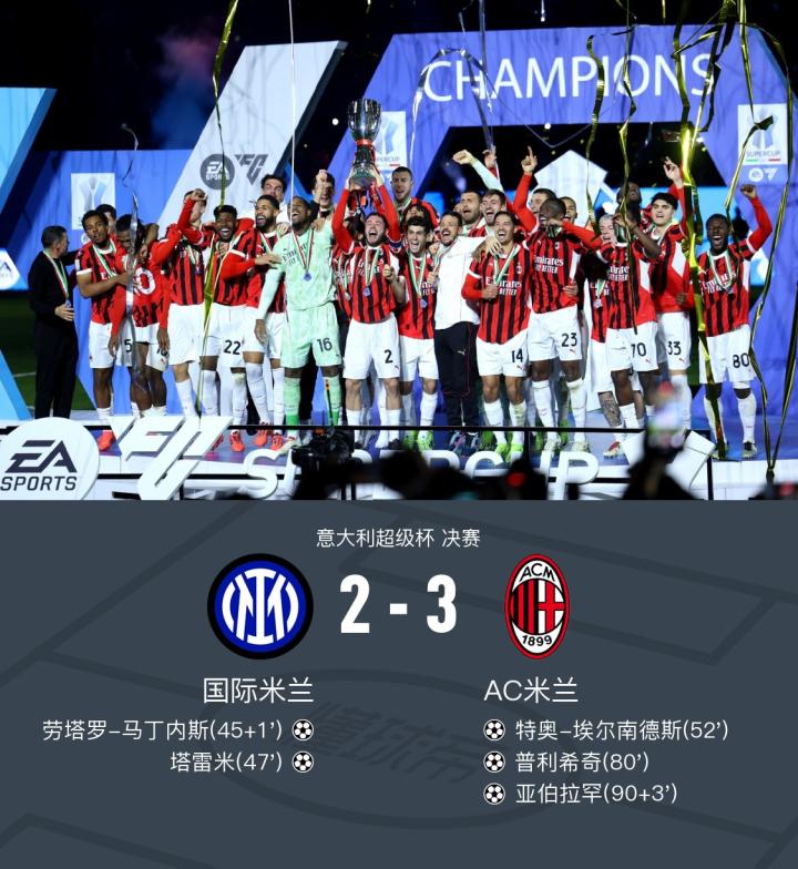 在意大利超级杯决赛中,国际米兰与AC米兰展开了一场激烈的对决。上半场赖因德斯低射滑门而出,迪马尔科爆射被迈尼昂神勇扑出,劳塔罗低射破门,下半场塔雷米兜射扩大比分,特奥任意球扳回一球,普利希奇低射扳平,亚伯兰罕绝杀比分。最终,AC米兰以3比2逆转战胜国际米兰,赢得了这场精彩的对决。